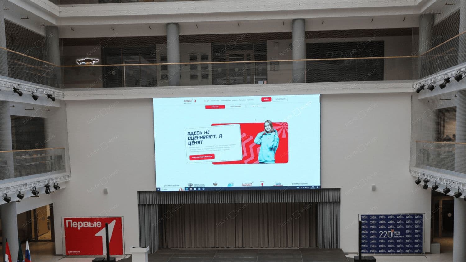 Компания Future Vision изготовила светодиодный экран для средней общеобразовательной школы № 220 имени К.Д. Ушинского. Теперь вместо традиционного, изолированного актового зала в школе есть атриум со светодиодным экраном на стене.