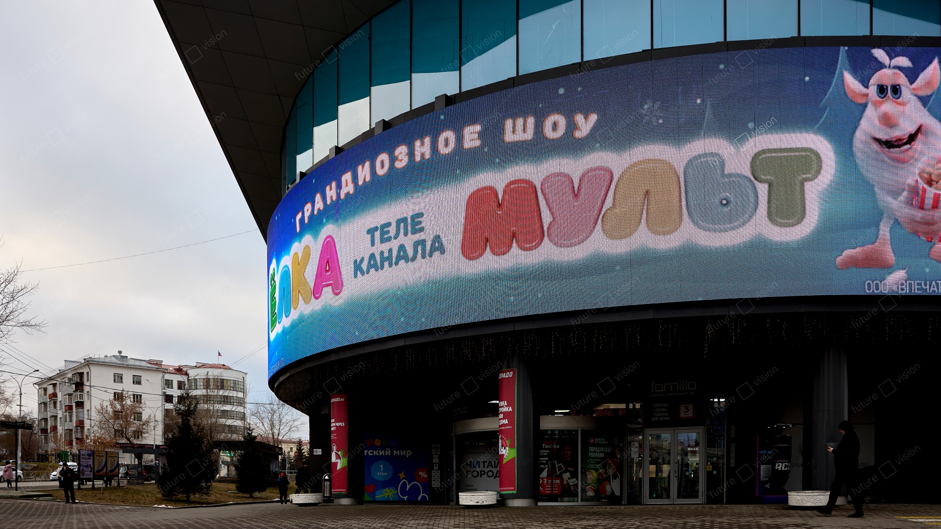 Специалисты завода Future Vision изготовили и установили светодиодный медиафасад для торгово-развлекательного центра «Алатырь», город Екатеринбург. Размер экрана составляет 42 500 х 5 000 мм, площадь — 212 м2, шаг пикселя — Р16-16.