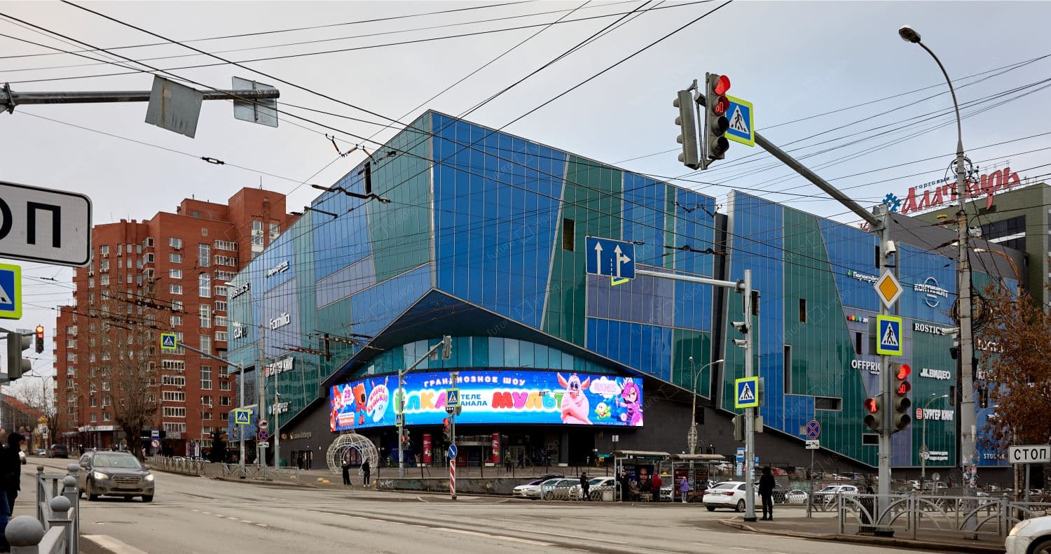 Специалисты завода Future Vision изготовили и установили светодиодный экран для торгово-развлекательного центра «Алатырь», город Екатеринбург. Размер светодиодного полотна составляет ___, площадь экрана __ м2, шаг пикселя Р5.